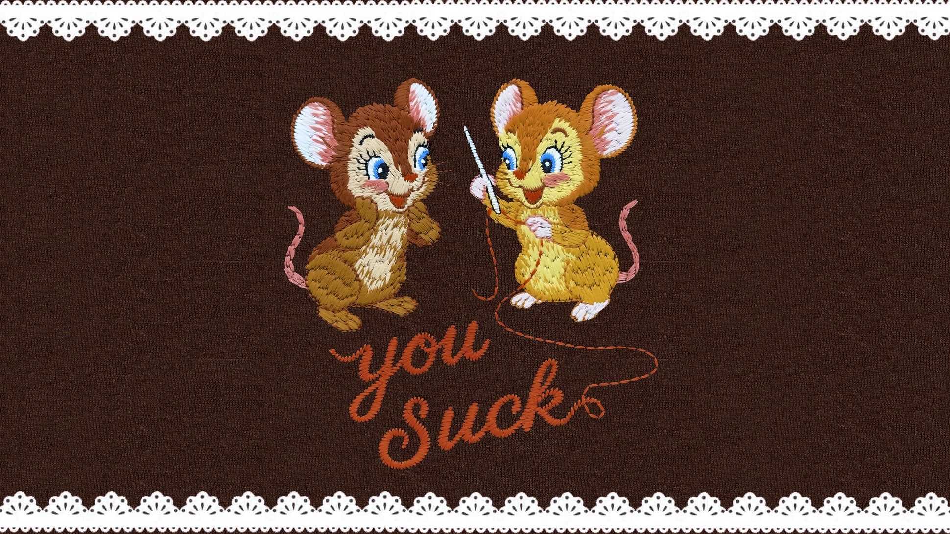 Move over! Make way! Coming through! Get ready! Ooooooh, shit! Here we come! The holy queens of embroidery! Hahaha! You know, we just fucking LOOOOOOVE creating embroidered tops with really really mean and rude sayings with a ton of swearwords and then add a whole bunch of cutesy lil’ animals to it, like white rabbits and bluebirds and fat hamsters, with some fresh flowery vintage elements and bows and shit....and Omigosh so kitsch and SO cute now!