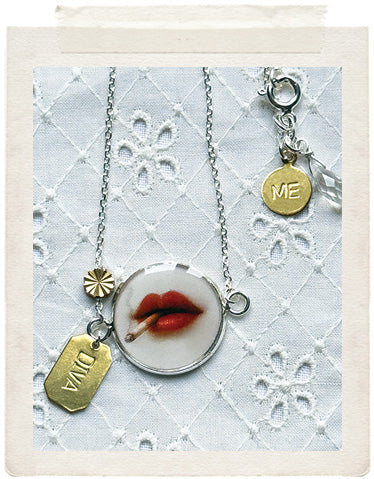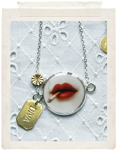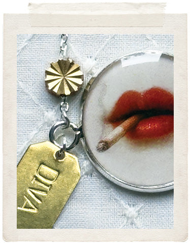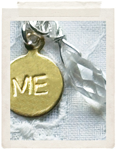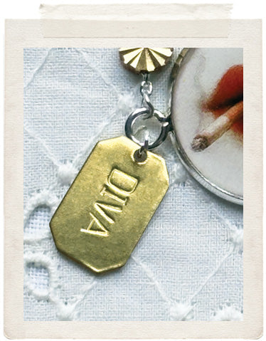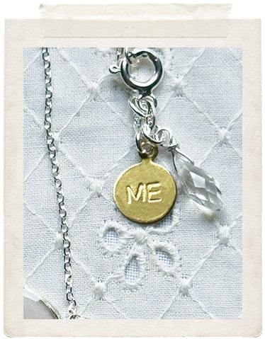 PENDANTS: a sterling silver plated medallion (glazed, sealed, crystal clear and waterproof), a dainty DIVA brass tag, a vintage fine diamond cut charm in shiny brass, a faceted Swarovski crystal drop and a stamped ME charm on the back of the necklace, so you look adorable from all sides!