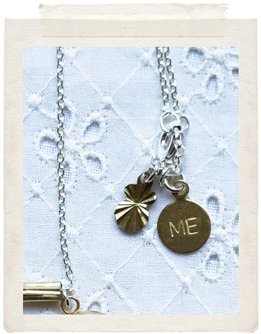 PENDANTS: Miniature: small brass medallion (glazed, sealed, crystal clear and waterproof), vintage fine diamond cut charms in shiny brass and a stamped ME charm on the back of the necklace, so you look adorable from all sides!