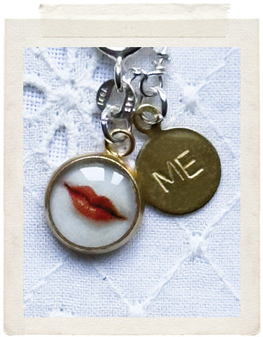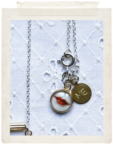 PENDANTS: Miniature:small brass medallion (glazed, sealed, crystal clear and waterproof), vintage fine diamond cut charms in shiny brass and a tiny lips charm and a stamped ME charm on the back of the necklace so you look awesome from all sides!