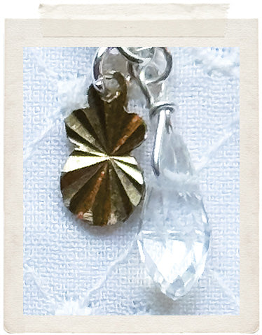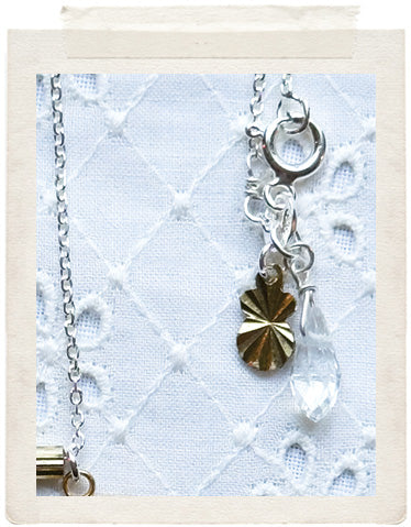PENDANTS: Miniature: small brass medallion (glazed, sealed, crystal clear and waterproof), vintage fine diamond cut charms in shiny brass and a faceted Swarovski crystal drop on the back of the necklace, so you look adorable from all sides!