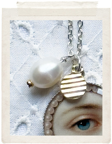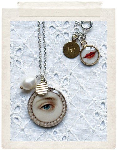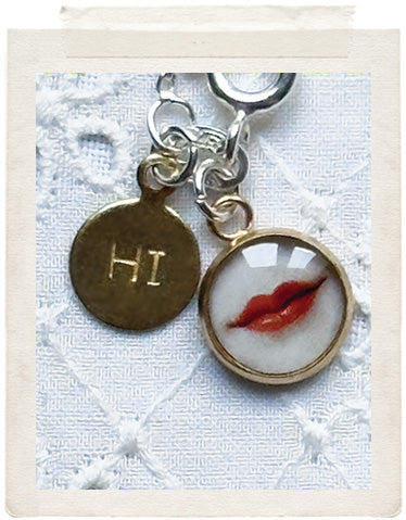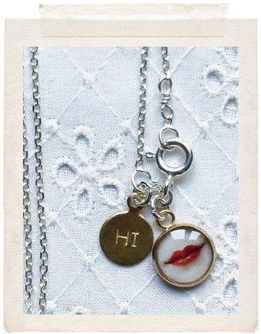 PENDANTS: a sterling silver medallion (glazed, sealed, crystal clear and waterproof), a real fresh water pearl, a vintage fine diamond cut charm in shiny brass, a tiny little smirking lips charm and a stamped "Hi" charm on the back of the necklace, so you look adorable from all sides!
